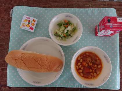 今日の献立は,味つけコッペパン・牛乳・大豆と鶏肉のトマト煮・アスパラガスのソテー・チーズです。