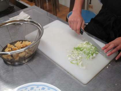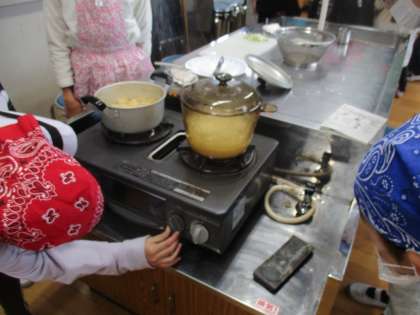 2度目の調理実習でした。ふだん炊飯器を使って炊くご飯ですが,ガラス鍋を使うと中の変化がよく分かります。火加減を調節しながら炊いたご飯は「いつものよりおいしい!」という声も。みそ汁は,いりこで出汁をとって作りました。残菜なし,大満足の昼食でしたね。