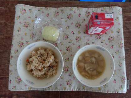 今日の献立は,炊きこみ五目ごはん・牛乳・みそ汁・りんごです。
