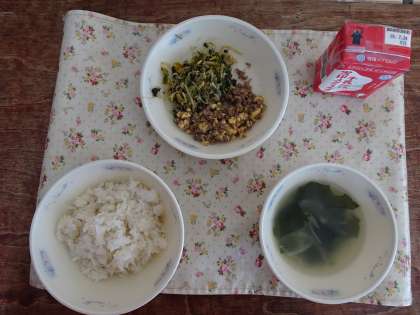 今日の献立は,麦ごはん・牛乳・ビビンバ(具)肉と卵・ビビンバ(具)ナムル・わかめスープです。