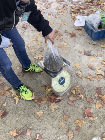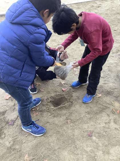算数では重さの学習をしています。gやkgの学習をしてから,実際に1kgがどれぐらいの重さなのかを体感すべく,砂場で1kgの砂を量ってみました。