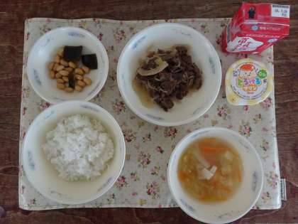 今日の献立は,ごはん・牛乳・牛丼の具・こんぶ豆・キャベツの吉野汁・豆乳プリンです。