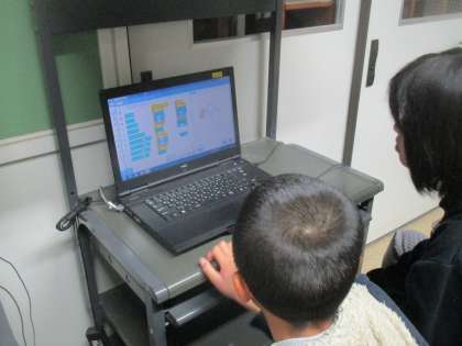 「スクラッチ」というソフトを使って,プログラミングについて学習しました。最初「プログラミングって何?」と言っていた子どもたちでしたが,自分が考えた指示でスプライトを動かすという仕組みが分かると,とても楽しそうに取り組んでいました。