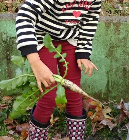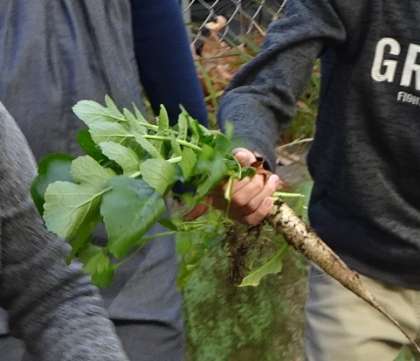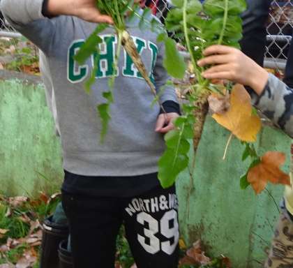 ひまわり学級の畑で育てている大根の間引きをしました。1人1本ずつ抜きました。「思っていたよりも大きくなっているね。」「どっちの大根が大きいかな。」など,1本抜くごとに楽しそうな声が聞こえました。