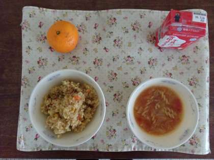 今日の献立は,カレーピラフ・牛乳・トマトスープ・みかんです。