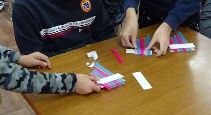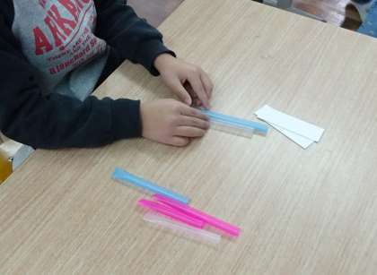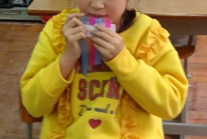音楽科の学習で,パンフルートを自作しました。画用紙とストローを使って作ります。「ストローの長さが違うよ。」「長いストローから順番に並べていこう。」など,みんなで相談しながら作りました。完成したパンフルートを吹くには,少しコツが必要です。「リコーダーみたいに吹いても音が出ないね。」「唇に上手く当てて吹くと良い音が出るよ。」など,吹き方も互いに創意工夫しながら活動することができました。