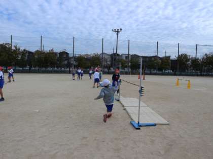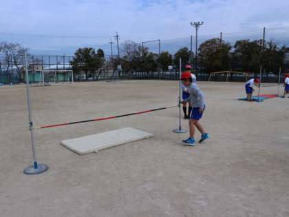 最初は「怖いなあ。」「痛そう。」と言っていた子どもたちでしたが,跳んでみると高とびの面白さに気づき,どんどん挑戦していました。空中での姿勢や足の使い方を工夫しながら今後も自分の記録と向き合ってほしいです。