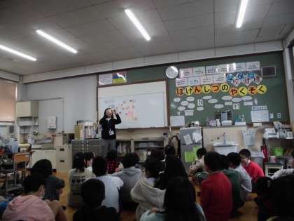 かぜのウイルスが体の中に入って風邪の症状がおこる仕組みや咳の役割などの話をしました。その中で,薬の正しい飲み方や普段から心がけることなどを一緒に考えました。お子さんにぜひ聞いてみてください。また,高学年の子どもたちには「栄養ドリンクで疲れがとれる?」や「目薬のさし方」の話をしました。ぜひ聞いてみてください。