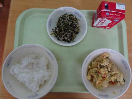 今日の献立は,ごはん(京北米)・牛乳・あげたま煮・ほうれん草ともやしのごま煮です。