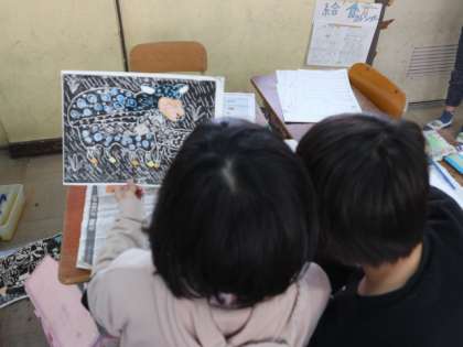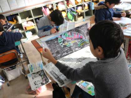 白黒とはまた違う仕上がりになって,友だちと見合いながら作品作りを楽しんでいました。