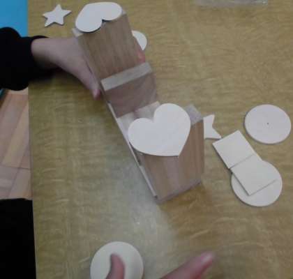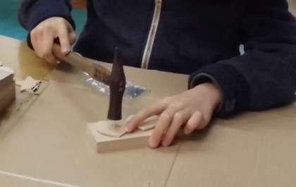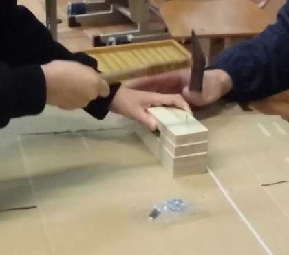 木と木をくぎを使ってつなぎ,自分の好きな形を表す学習をしています。「どんな形にしようかな。」「ためしに木を並べてみよう。」など,くぎを打つ前にそれぞれが自分の好きな形を表そうとアイデアを膨らませていました。実際にくぎを打ち始めると,あっという間にコツを掴んで,「トントントン…」とリズム良いくぎ打ちの音が教室に響きました。どんな作品が出来上がるか楽しみです。