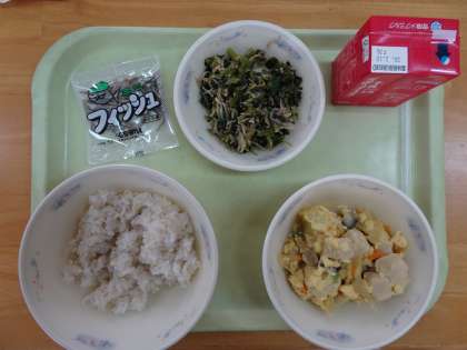 今日の献立は麦ごはん・牛乳・高野どうふの卵とじ・ほうれん草ともやしのごま煮・じゃこです。