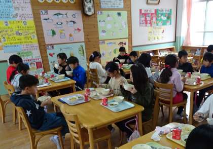 今日は4−4がランチルームで給食を食べました。