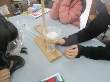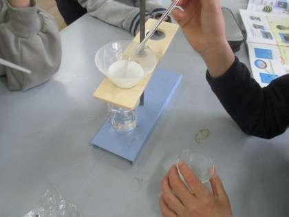 液の中にホウ酸が溶けているか確かめるために,まず溶け残ったホウ酸を取り除くろ過を行いました。ろ紙,ろうと,ビーカー,ガラス棒を使い,苦戦しながら無事に完了しました。使える器具,できる操作がどんどん増えますね。