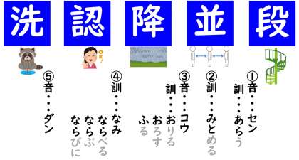 (1)段・並・降・認・洗の音読み・訓読みを声に出して読んでみましょう。