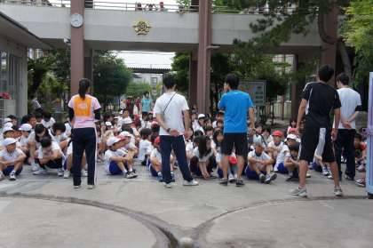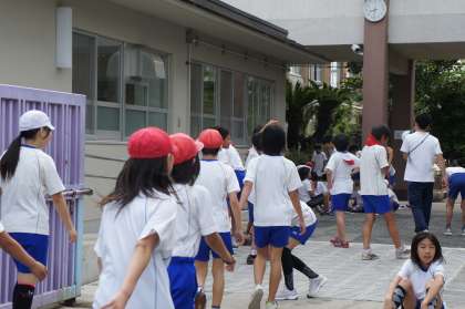 初日の今日は,6年生全員と5年生の有志が,登校後すぐ正門前に集まり,学校の外周(約850m)を2周走りました。