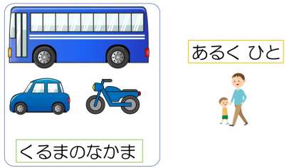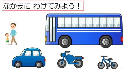 くるまのなかま と あるくひと に わけてみましょう。