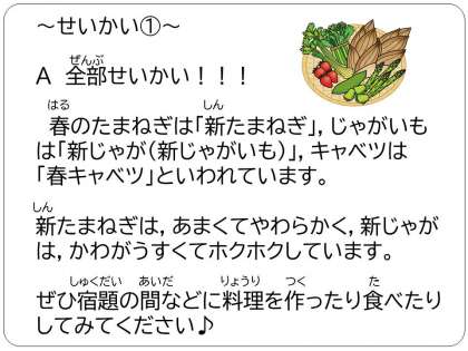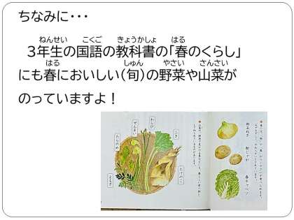 ほかにも春においしい野菜がたくさんあるので,ぜひ調べたり聞いたりして