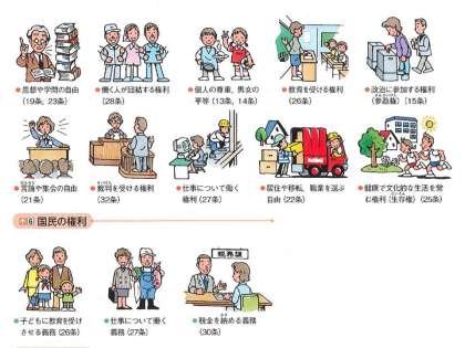 憲法は,基本的人権の尊重を原則の一つとし,上の図のように,さまざまな国民の権利を保障しています。また,憲法には,国民が果たさなければならない義務についても定められています。わたしたちは,憲法の定める権利を正しく行使するとともに,おたがいの権利を尊重する態度を身につけるように努力していくことが必要です。