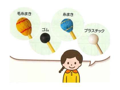 また,打楽器の場合は,叩くものによっても音色が変わります。