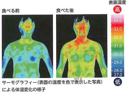朝食を食べる前と食べた後の,体の表面の温度です。