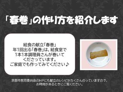 人気な献立の1つ「春巻」は,調理員さんが約750人分の春巻を1つずつ1つずつ丁寧に巻いて,揚げてくださっています。