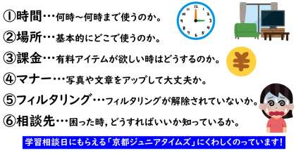 次の6つの項目について,お家の人と話って決めておきましょう。