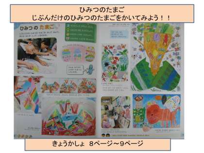 きょうかしょ8〜9ページを見て,じぶんならどんなたまごにしたいかをかんがえてみよう。かんがえられたら,じっさいにかいていろもぬってみよう。ちがうかみに大きくかいてもいいですよ。