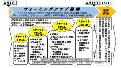 令和2年3月5日からの休業期間が3か月に及ぶことから,再開に向けては,段階的に,通常の教育活動へ繋げることとします。