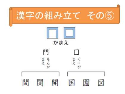 これもよく出てきます。「開」「関」「間」などの「もんがまえ」,「図」「園」「国」などの「くにがまえ」があります。