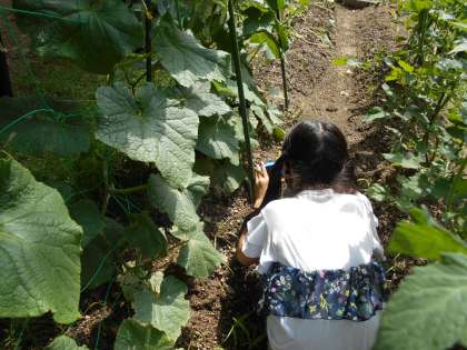 「ここにもキュウリできてる!」「見て!このトウモロコシ,ふさふさがあるねん。」