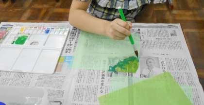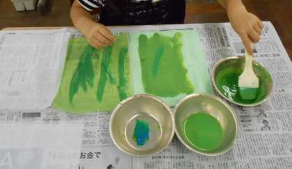 はじめに,キュウリの葉の色の紙を作りました。薄い紙に,自分が決めたキュウリの葉の色を塗ります。薄い紙なので,絵の具や水の量,力加減でやぶれてしまいます。「やぶれた〜」「ちょっと濃いかな」など,話しながら,丁寧に塗ることができました。