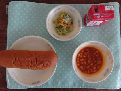 今日の献立は,味つけコッペパン・牛乳・ポークビーンズ・アスパラガスのソテーです。