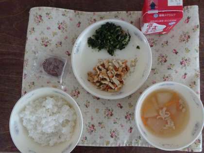 今日の献立は,ごはん・牛乳・こぎつねちらしの具・だいこんばのいためもの・とうがんのくずひき・おはぎです。