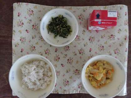 今日の献立は,麦ごはん・牛乳・あげたま煮・だいこん葉のごまいためです。