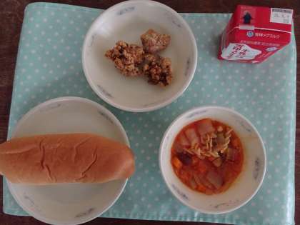 今日の献立は,味つけコッペパン・牛乳・スパイシーチキン・ミネストローネです。