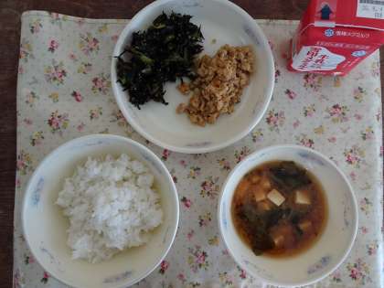 今日の献立は,ごはん・とりそぼろ丼の具・小松菜とひじきのいためもの・みそ汁です。