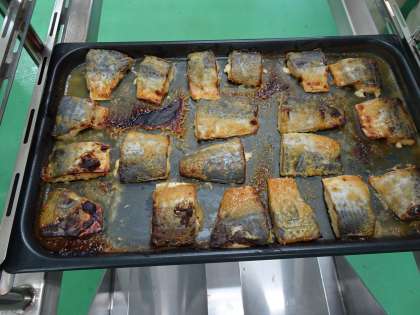 さわらの西京焼きは,スチームコンベクションオーブン(スチコン)を使って作りました。白みそやしょうゆ,三温糖などで下味をつけたさわらをスチコンで焼いて仕上げました。しっとりとしていて,甘みもありおいしかったです。ごはんがすすむ味でした。