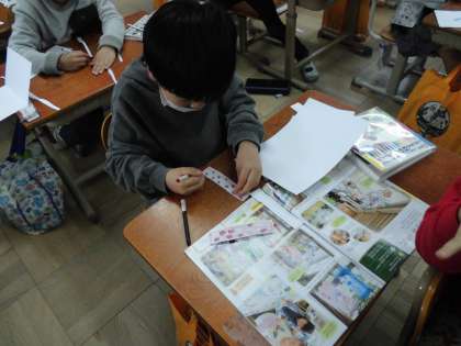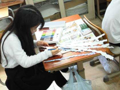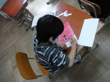 画用紙をはさみで切って色をつけたり,顔をかいたり