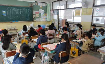 しーんと静まりかえった教室内に,食器を置く音やお箸を使う音などが響いています。