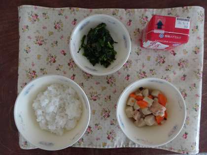 今日の給食は,ごはん・牛乳・高野どうふと野菜の炊きあわせ・ほうれん草のおかか煮です。