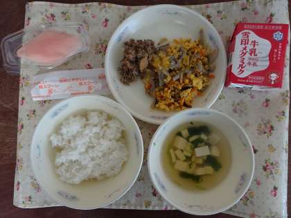 今日の献立は,ごはん・牛乳・ちらしずしの具・さばそぼろ・みつばのすまし汁・三色ゼリーです。