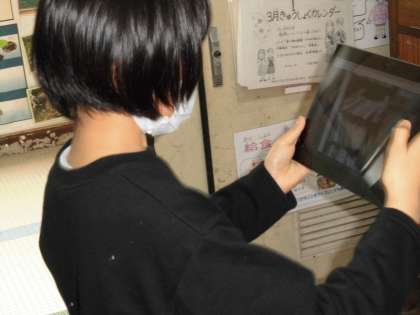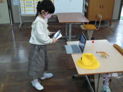 前回の『コンピューターをつかってみよう』では,タブレット端末に慣れることをめあてに画面をタッチしたり,スワイプしたりして,図形を組み合わせてロボットを描きました。今回は,ロイロノートスクールを使って,「これは何でしょう?クイズ」をつくりました。それぞれタブレット端末を持って,教室の中にあるものを選び,アップの写真を撮ります。そして,みんなで写真を共有して,クイズにしました。「これ,私が撮ったよ。」「これなんやろ??難しいなぁ。」など,いろいろな声が聞こえてきました。