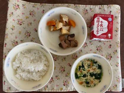 今日の献立は,ごはん・牛乳・なま節と厚あげのにつけ・かきたま汁です。