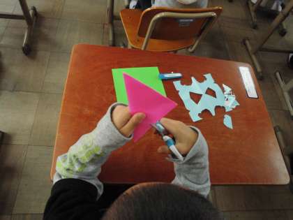 図画工作の時間に,はさみと折り紙で