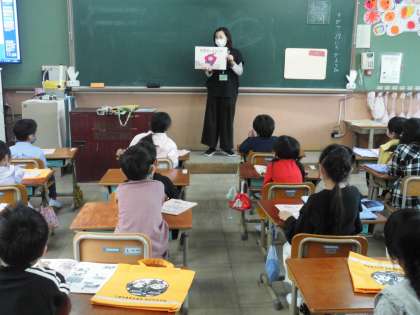 初めに,図書館司書の先生から図書館での過ごし方や借り方について,紙芝居で教えてもらいました。