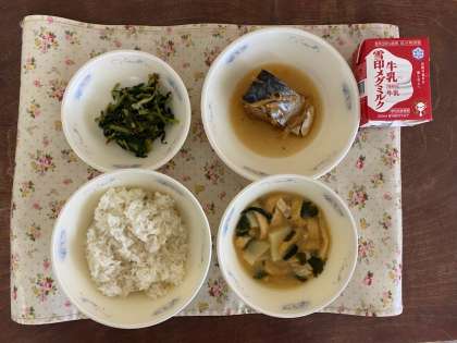 今日の献立は,麦ごはん・牛乳・さばのしょうが煮・だいこん葉のいためもの・みそ汁です。