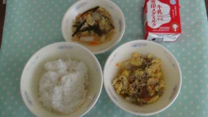 今日の献立は,ごはん・牛乳・他人煮・ごま酢煮 です。