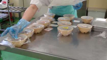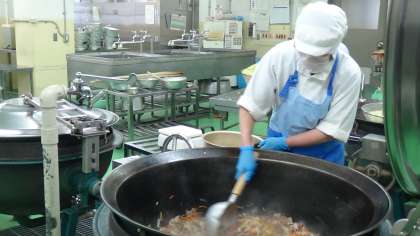 「他人煮」には、鶏卵が入っていますので,この日は鶏卵なしの除去食の提供をしています。給食室では,予め当日の動きの打合せをして,それに沿って除去食の担当者が,調理をします。