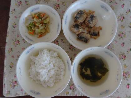 今日の献立は,ごはん・いわしのこはくあげ・キャベツのごま煮・若竹汁です。